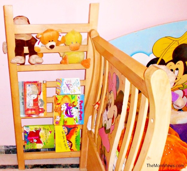 There is nothing more I love than a good recycling project. I hate wasting things and whatever I can salvage for a good use, I try to do that. While we converted the cot into a daybed we were left with the drop-side rail of the cot. I didn’t want to throw it away and after some searching landed up on a really cool idea. We have now converted the rail into a stuff-toy cum book display. We store all the small stuff toys as well as the books that Sam is reading during that week. Kids can easily take stuff and put it back so it is pretty functional too. You can use it to store blankets, swaddling clothes or bed sheets for kids room or even convert it into a magazine display for your room.