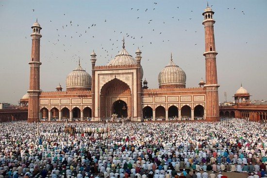 2. On Eid morning, everyone showers and wears their new clothes. Dabbing on some perfume is also recommended and the whole family goes to the Eidgah, which is an area demarcated for the Eid prayer. It may be outdoors or indoors, depending on the weather. People wish each other and the special prayer is carried out in congregation. Here is a picture of the Eid prayer being held at the famous Jama Masjid in Delhi.