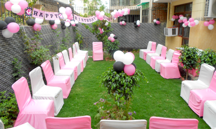 We went for pink and white balloons along with a splash of black. I bought lot of customized decorations for the party from an online store. We again outsourced the balloons and chairs and by the end it was looking like Barbie land in our backyard.
