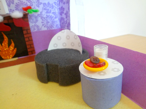 5. Now, the furniture. We’ve made a chair and table. The chair is a single piece of sponge from a watch box. Make a slit along one side and insert patterned paper cut into a semicircle. You can also make a sofa as described in our Doll House post.