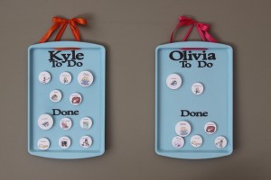 I came up with a list of chores that each child could handle for their age and talked with them about how it needed to be done.  The first week I went through and did each choose with them so that they had a better understanding of how to do it.  My daughter at three has different chores than my son at five and I will be adding chores as they get older by making new magnets.  I chose to use cartoon pictures of the chore as well as words so that they were clear on what to do and also to make the chart more fun for them.  My daughter needs the visual picture of the chore on the magnet to understand.  I usually have to prompt her a little more, and return to the chart with her to help her move one to the done section and choose the next job to be done.  Once she has some direction, though, she is off to the races.