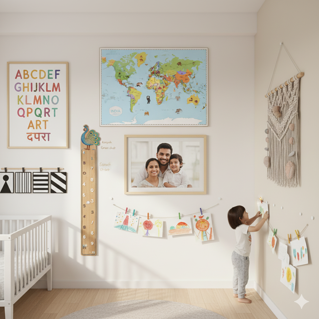 - Educational Art: Integrating learning tools into the decor is a seamless way to reinforce concepts. Large-scale world maps or maps of India 20 serve as constant references for geography. “Alphabet art” in regional languages or English, rendered in artistic fonts, bridges the gap between learning and aesthetics.21