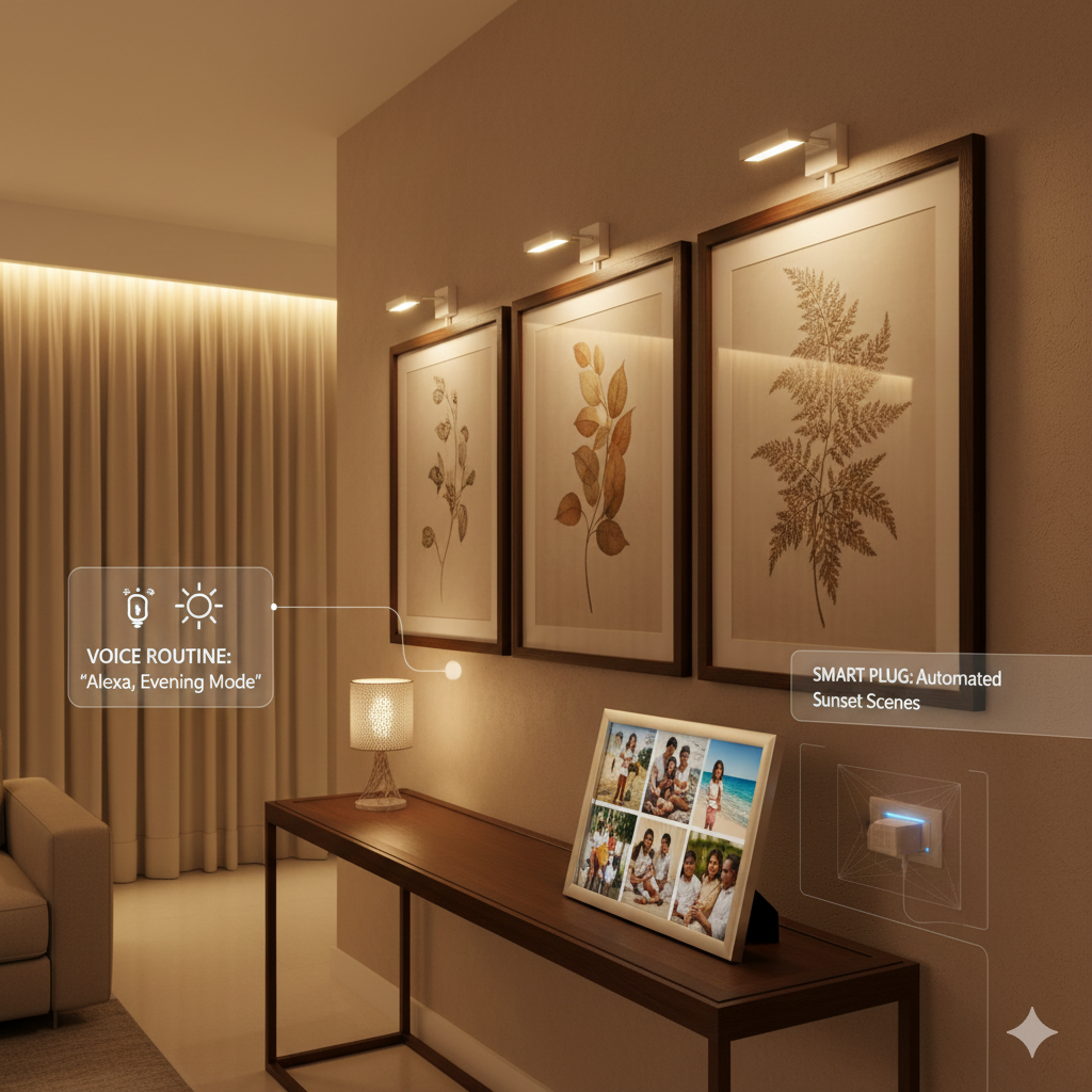 - Voice Routines: Integrate lights with Alexa or Google Assistant. A single command like “Alexa, Evening Mode” can dim the main lights, turn on the art accent lights, and play soothing music, instantly transitioning the home from “work mode” to “family mode”.59