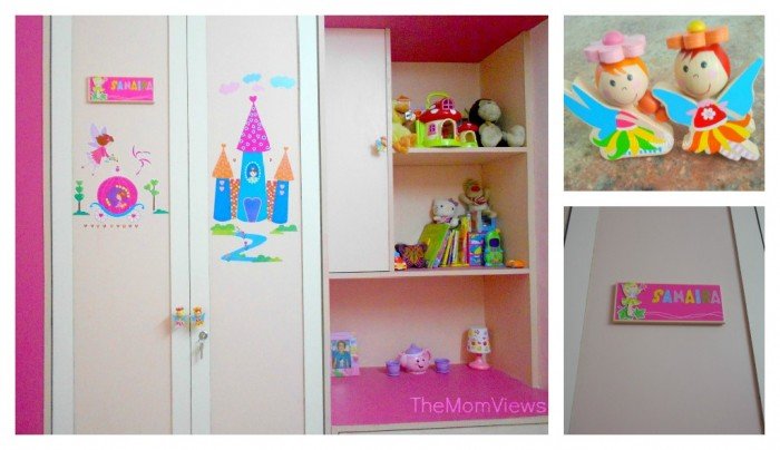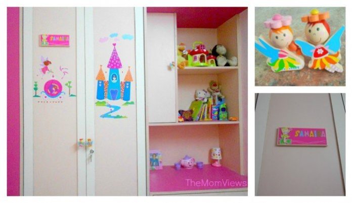 I had gone for the classic two toned look but guess what? Classic doesn’t really gel with a vivacious and spirited three-year old so I jazzed up the wardrobe with a Fairy name plate from Vividha and some fairy princess wall stickers. It is a smashing hit with the little one now.