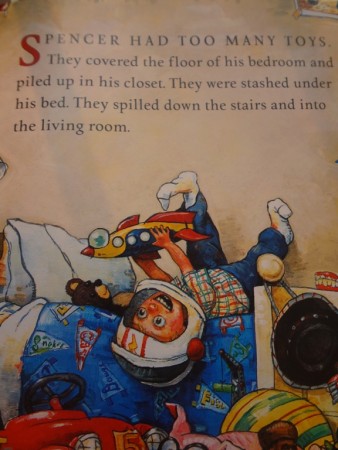 Every imaginable kind of toy is featured in this delightful little book, and kids will love identifying the individual toys that Spencer has. Every illustration is extremely detailed, and more than half the fun in reading this book is in looking at all the little details hidden in the pictures.